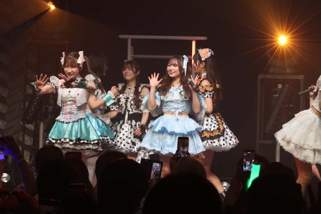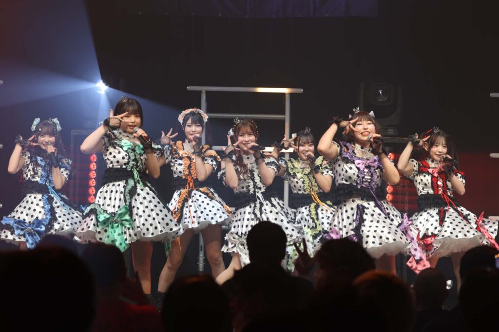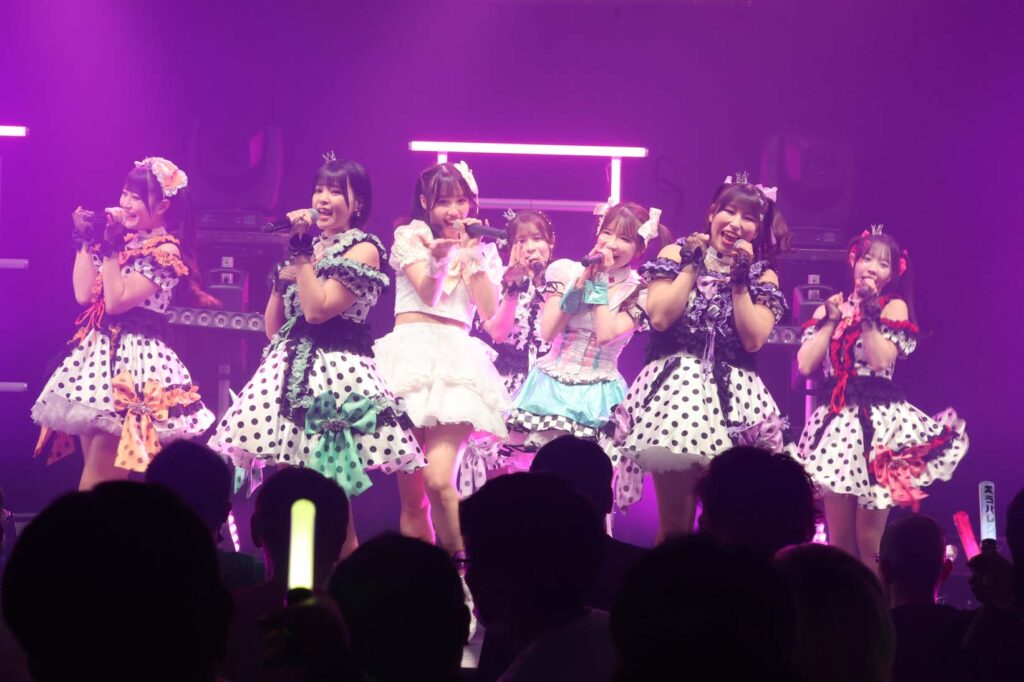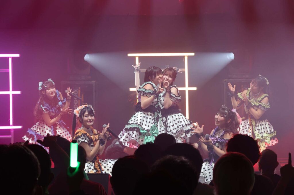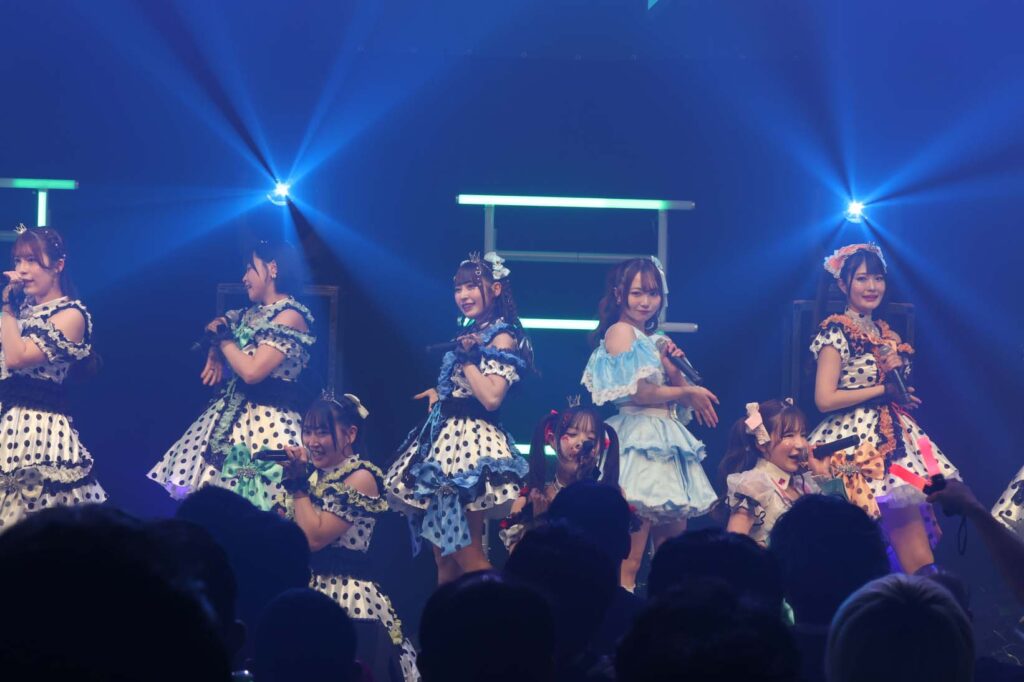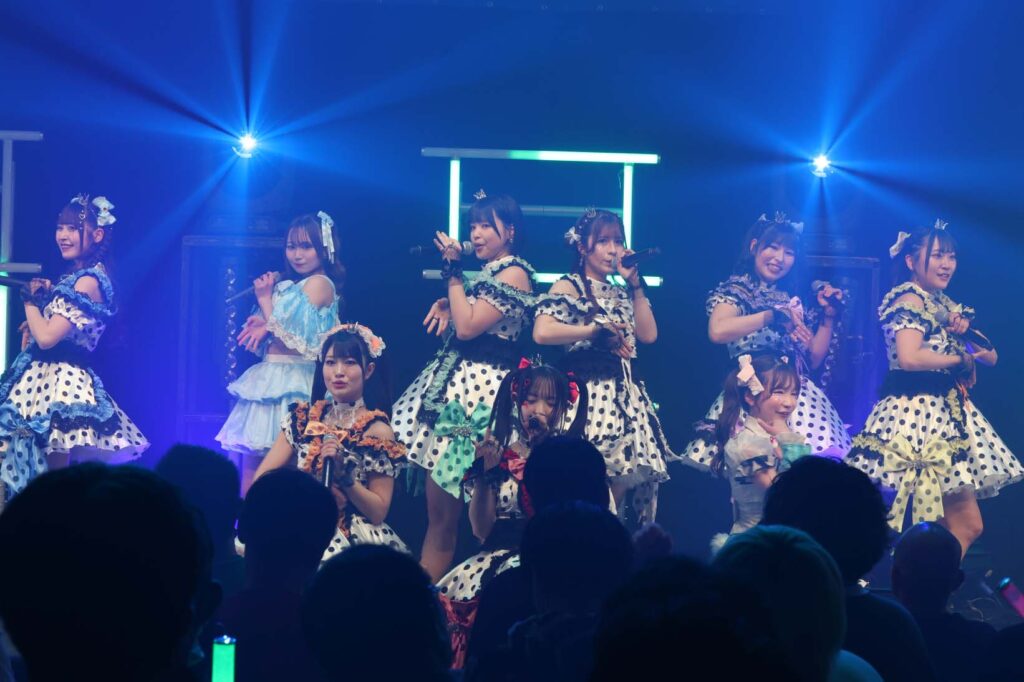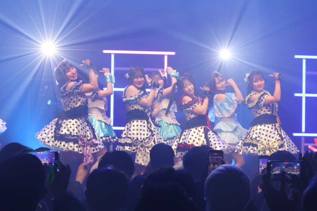 “ここからは現役メンバー7人でラストスパート!盛り上がっていきましょう!”城咲の掛け声で「囚われのMirage」、「アンビバレンス」、「逆境ノンフィクション」、「キミをつくる全ての要素」と続けて熱量高くパフォーマンスすると、“10周年ライブラストの曲です!”みるものシャウトでかわいくてキャッチーな人気ナンバー、「気になる?もっと好きになる!」でフロアに大きなコールが響き、ペンライトの波が揺れた。