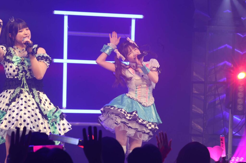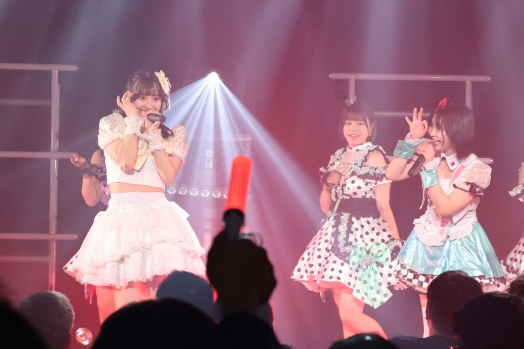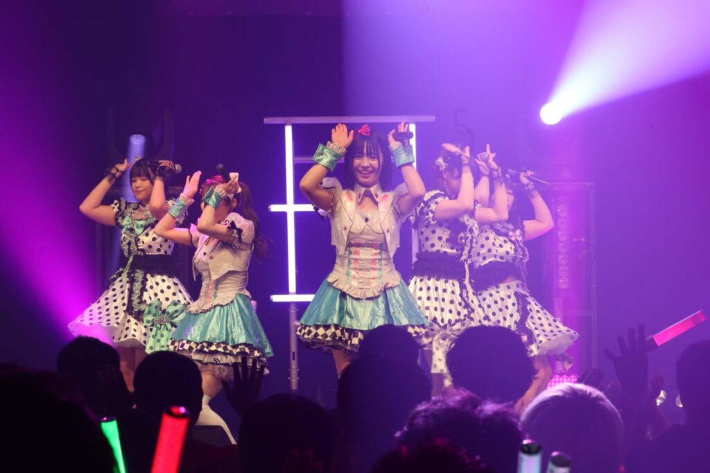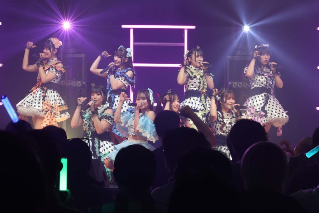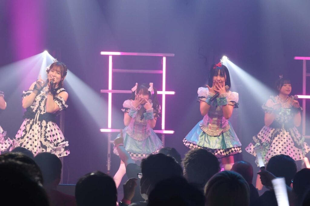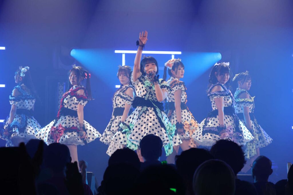 “ここからは現役メンバー7人でラストスパート!盛り上がっていきましょう!”城咲の掛け声で「囚われのMirage」、「アンビバレンス」、「逆境ノンフィクション」、「キミをつくる全ての要素」と続けて熱量高くパフォーマンスすると、“10周年ライブラストの曲です!”みるものシャウトでかわいくてキャッチーな人気ナンバー、「気になる?もっと好きになる!」でフロアに大きなコールが響き、ペンライトの波が揺れた。