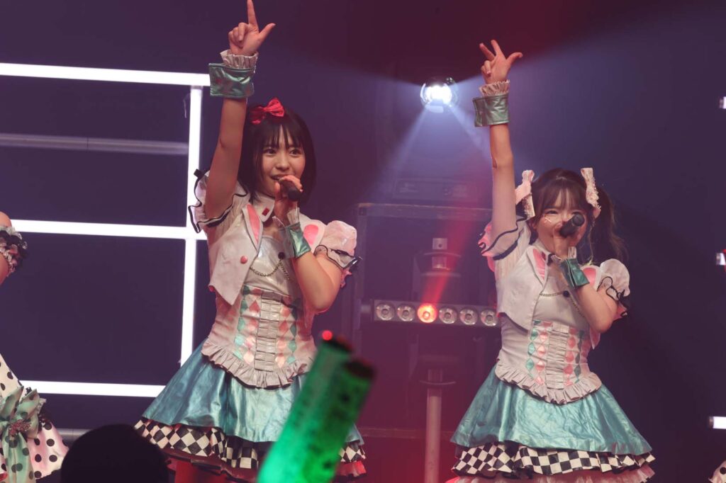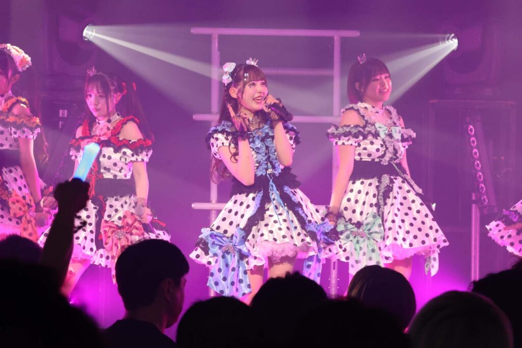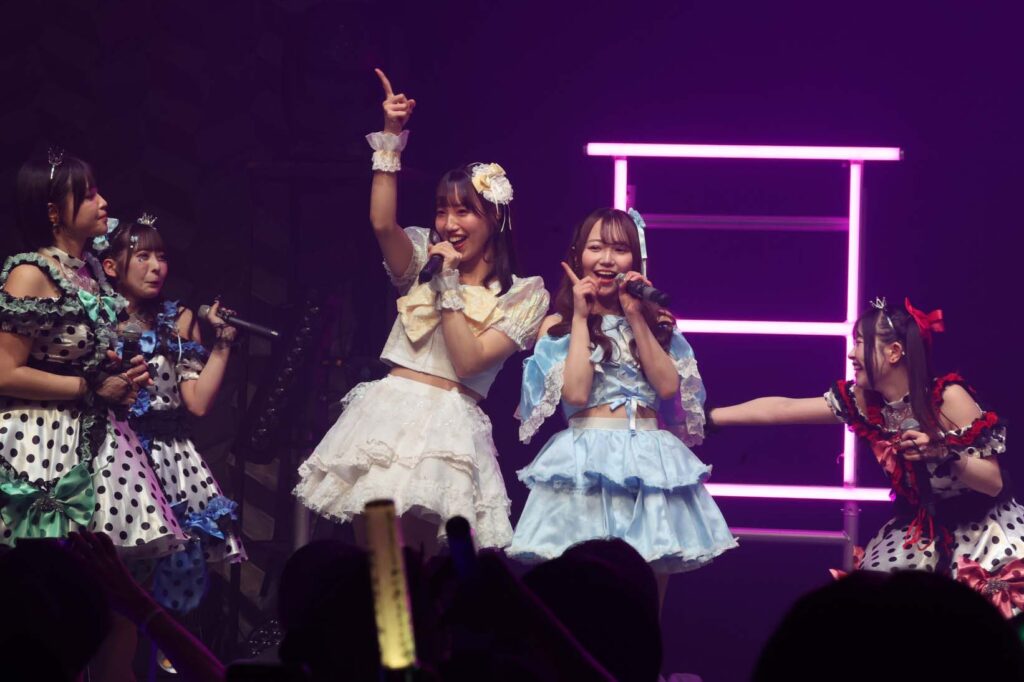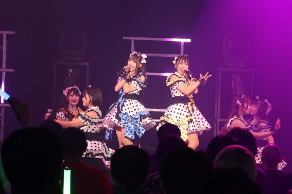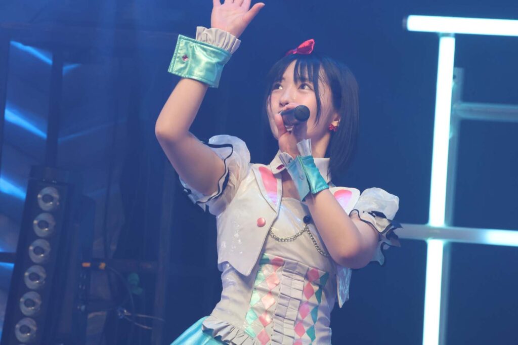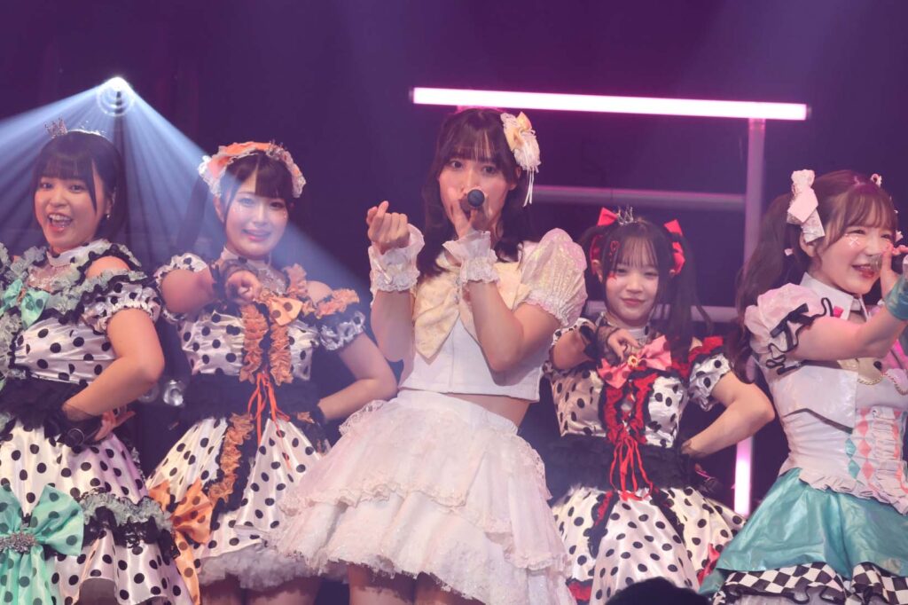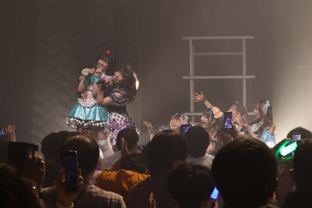 “ここからは現役メンバー7人でラストスパート!盛り上がっていきましょう!”城咲の掛け声で「囚われのMirage」、「アンビバレンス」、「逆境ノンフィクション」、「キミをつくる全ての要素」と続けて熱量高くパフォーマンスすると、“10周年ライブラストの曲です!”みるものシャウトでかわいくてキャッチーな人気ナンバー、「気になる?もっと好きになる!」でフロアに大きなコールが響き、ペンライトの波が揺れた。