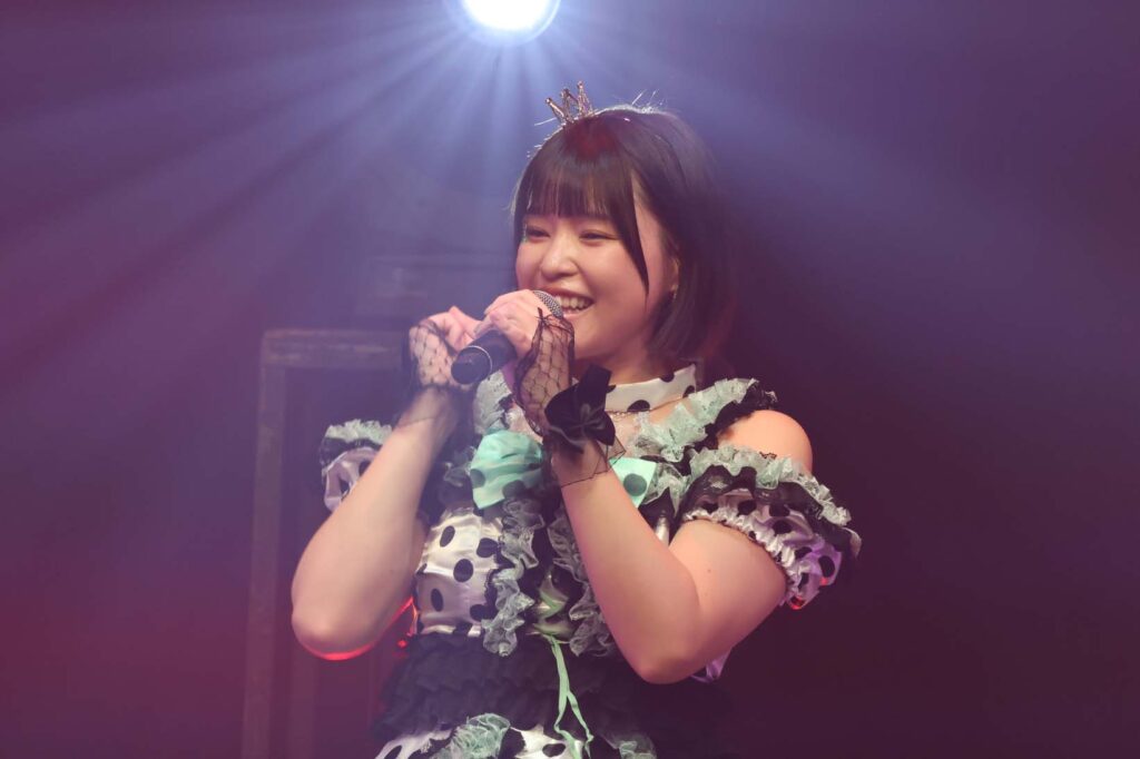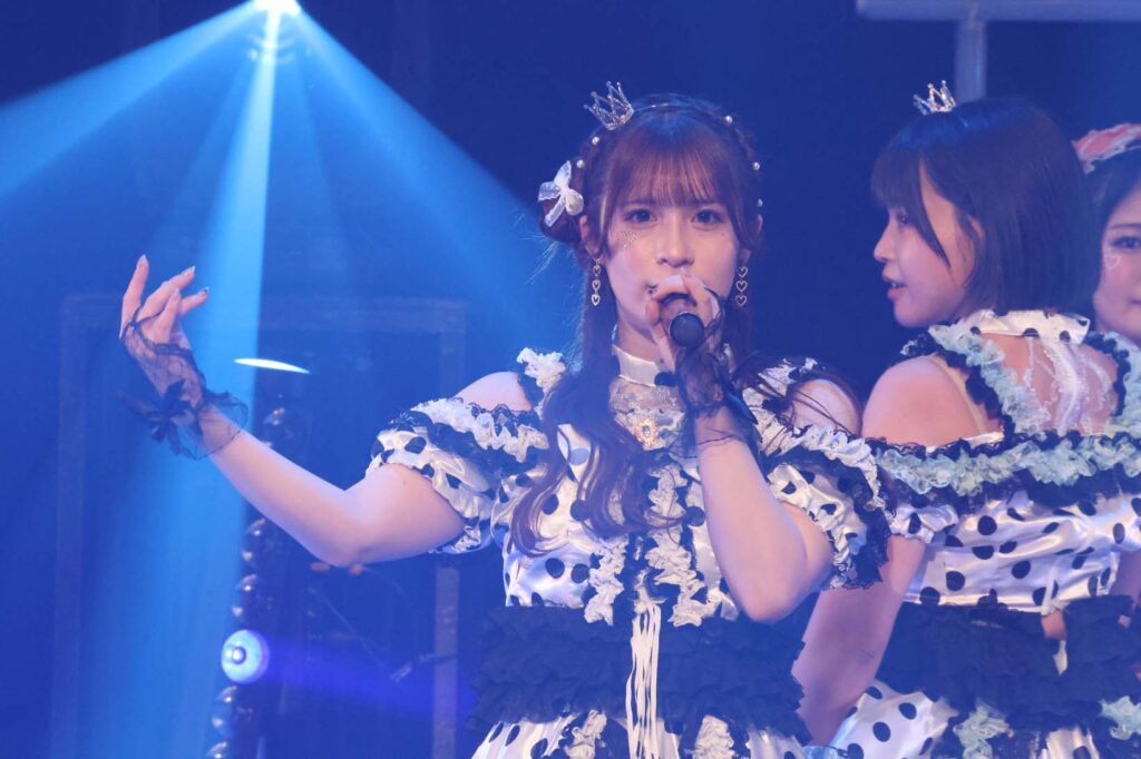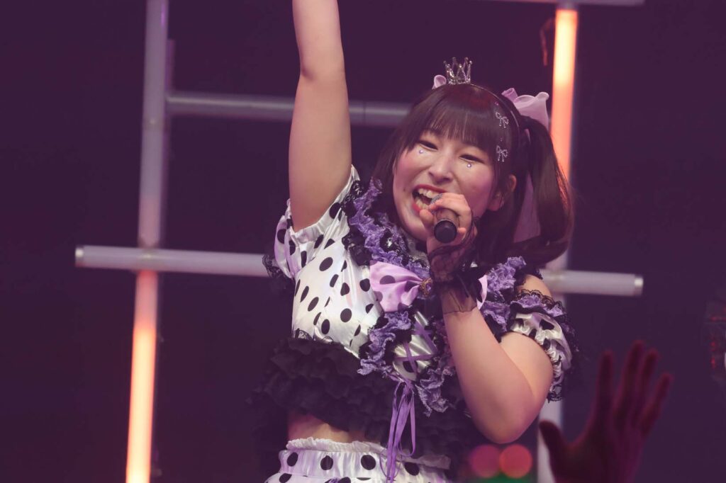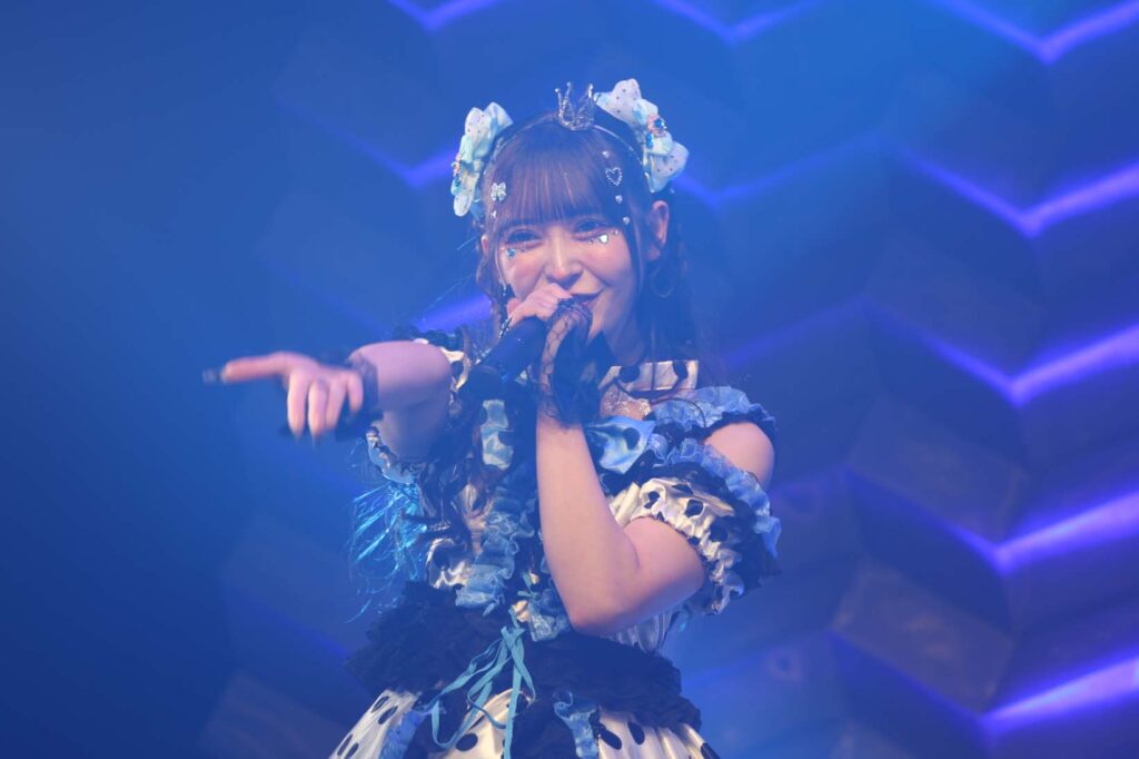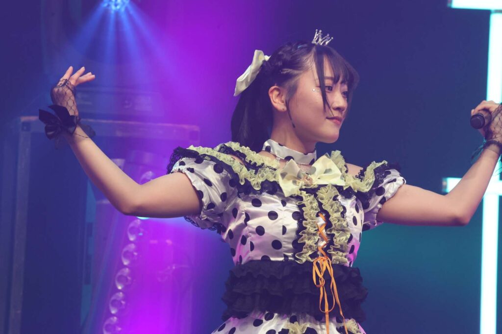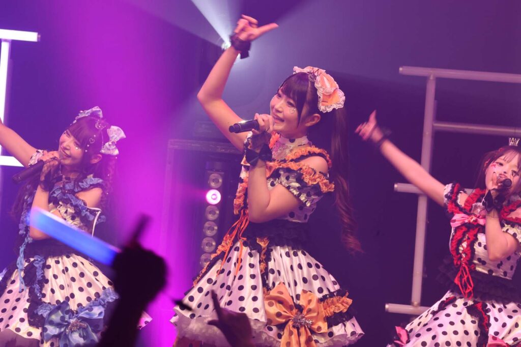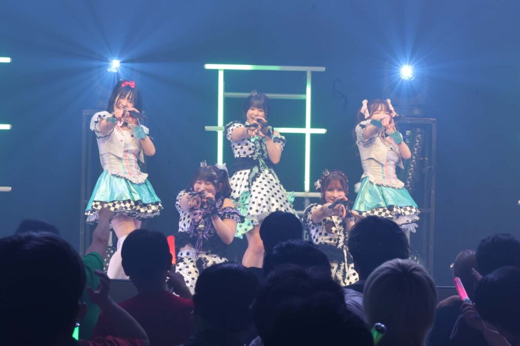“ここからは現役メンバー7人でラストスパート!盛り上がっていきましょう!”城咲の掛け声で「囚われのMirage」、「アンビバレンス」、「逆境ノンフィクション」、「キミをつくる全ての要素」と続けて熱量高くパフォーマンスすると、“10周年ライブラストの曲です!”みるものシャウトでかわいくてキャッチーな人気ナンバー、「気になる?もっと好きになる!」でフロアに大きなコールが響き、ペンライトの波が揺れた。
